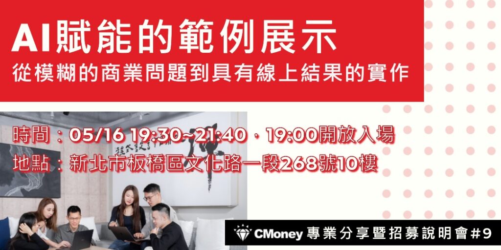如果你也熱愛 AI 技術,同時關心使用者體驗與商業價值,誠摯邀請你參與未來 CMoney 的專業分享暨招募說明會。這裡不只有技術深度,更有產品視角與商業溝通的歷練,讓你用專業創造影響,成為驅動產品與用戶價值的核心力量!